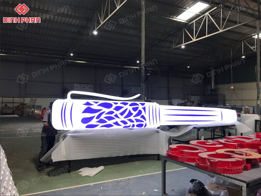 + Gia công ép nổi chất liệu mica và uốn khung nhôm định hình.